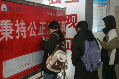 为进一步强化期末考风考纪教育,提升学生诚信应考意识,12月19日,beat365唯一官网于立信楼大厅开展以“坚守诚信考风正,秉持公正成绩真”为主题的诚信考试签名活动。