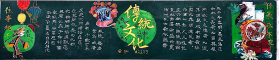 传统文化在心中,尺板方寸绘深情。各班认真组织,同学们积极参与,绘制出极具班级特色的中华优秀传统文化主题黑板报。各班级的黑板报主题鲜明,色彩搭配和谐自然,版面设计新颖独特,内容充实有吸引力,细腻的笔触镌刻下传统戏剧文化的绚丽篇章,艳丽的色彩绘制出民俗文化的绝美画卷,充分诠释了以爱国主义为核心的民族精神,充分展现了沉淀在国人心中的文化自觉与文化自信。
