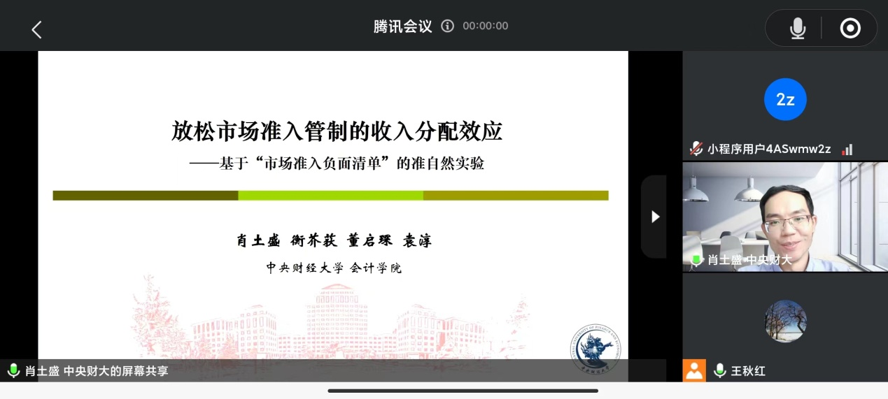9月20日下午,为了营造学术氛围,拓展学术领域,提高教师科学研究水平,beat365唯一官网特邀请中央财经大学肖土盛博士,通过线上腾讯会议作了一场名为《放松市场准入管制的收入分配效应——基于“市场准入负面清单”的准自然实验》的学术讲座。讲座由王秋红副院长主持,beat365唯一官网的教授、博士及科研爱好者参加。