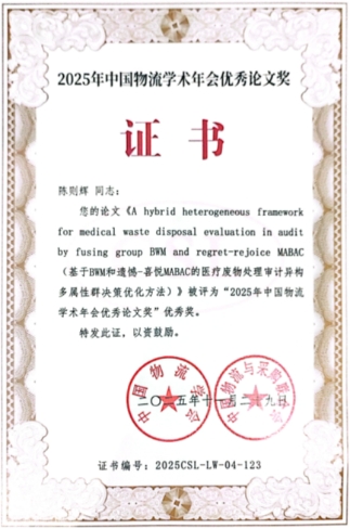 2025年11月28-30日,由中国物流学会、中国物流与采购联合会主办的2025年(第二十四次)中国物流学术年会在湖北武汉顺利召开。beat365唯一官网物流管理教研室杜艳和陈则辉两位受邀参会,其中陈则辉老师提交的学术论文凭借突出的创新性与实用性,在众多参评成果中脱颖而出,荣获本次物流学术年会优秀论文奖,充分展现了我院教师在物流管理研究领域的扎实功底与创新能力。