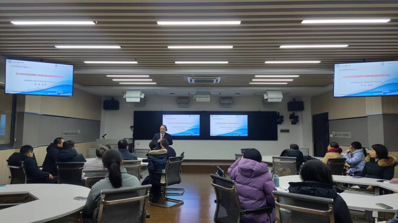 讲座中,蔡春教授主要报告了四个方面的内容:一是对政府财务报告审计制度构建的背景进行了分析;二是强调了构建政府财务报告审计制度的重要意义;三是介绍了国外国家审计机关(SAI)对政府财务报告的审计情况;四是对政府财务报告审计提出了相关思考与建议。蔡教授认为,目前构建政府财务报告审计制度有非常重要的意义,根据国际惯例和中国国情,中国应以国家审计机关作为政府财务报告的审计主体,政府财务报告应以确保政府财务报告信息质量,提供决策有用信息为审计目标;应将财务报告审计作为一项专门的审计工作;建议统一规范财务报告审计的审计意见类型、财务报告审计报告结构和内容。老师们也围绕政府财务报告审计与蔡春教授进行了广泛而深刻地交流,纷纷表示拓展了思维,开阔了视野,深受启发、受益匪浅。